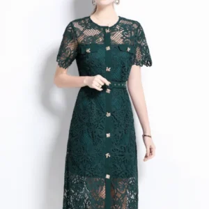 SMTHMA Fashion 2025 New Spring Short Sleeve Midi Lace Dresses for Women Single Breasted Aline Holiday Party Dress Female Vestido